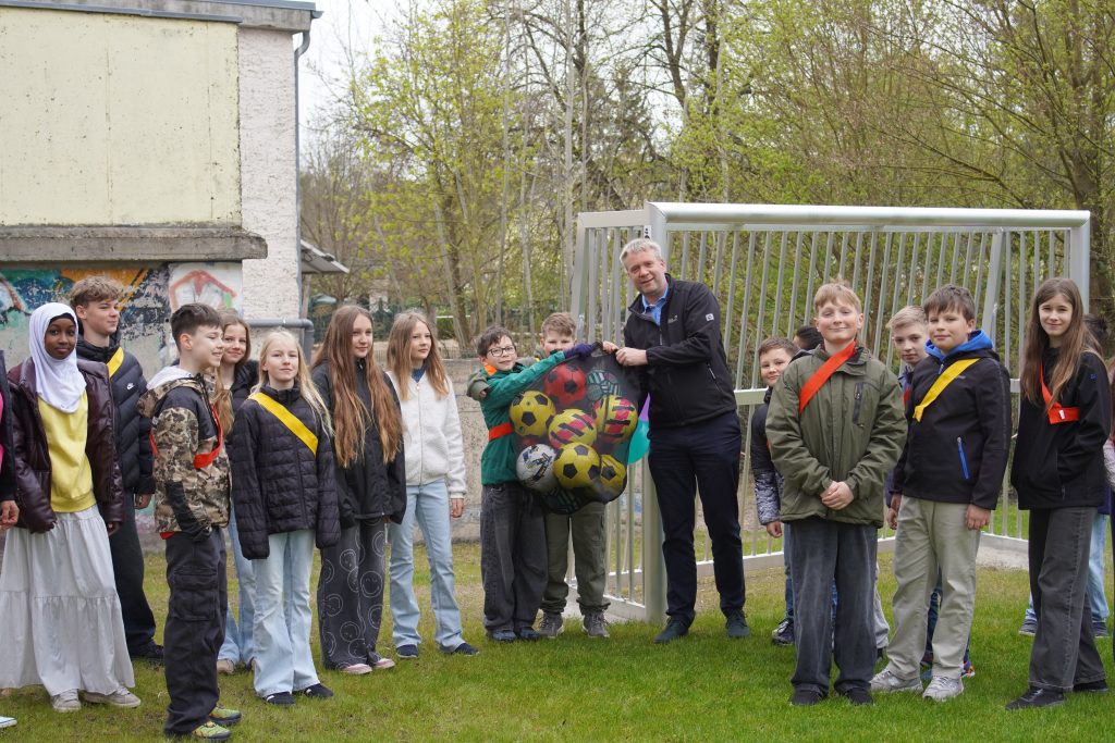 Am 24.04.2026 war es schließlich so weit: Die neue Fußballfläche konnte feierlich eingeweiht werden. Dieser neue Bewegungsraum ist ein großer Gewinn für unsere Kinder und wird bereits jetzt mit großer Begeisterung genutzt. Bewegung, gemeinsames Spielen und sportlicher Ausgleich gehören zu einem lebendigen Schulalltag dazu – umso mehr freuen wir uns, dass dieser Wunsch nun Wirklichkeit geworden ist. Zur Einweihung stellte Bürgermeister Herr Bruch zehn Fußbälle zur Verfügung und unterstützte damit diesen schönen Anlass. Ein Ballfangnetz soll in naher Zukunft noch folgen.